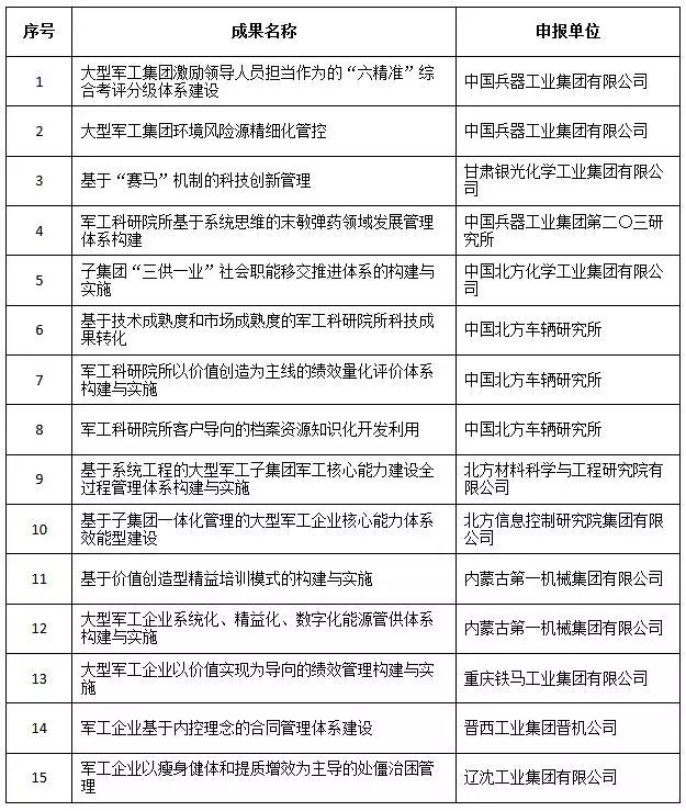 近日,中國兵器工業(yè)集團(tuán)4項(xiàng)創(chuàng)新成果獲全國企業(yè)管理現(xiàn)代化創(chuàng)新成果獎(jiǎng)、42項(xiàng)創(chuàng)新成果獲國防科技工業(yè)企業(yè)管理創(chuàng)新成果獎(jiǎng)。 全國企業(yè)管理現(xiàn)代化創(chuàng)新成果 經(jīng)全國企業(yè)管理現(xiàn)代化創(chuàng)新成果審定委員會(huì)終審,第二十五屆全國企業(yè)管理現(xiàn)代化創(chuàng)新成果公布,中國兵器工業(yè)集團(tuán)4項(xiàng)創(chuàng)新成果榮獲二等獎(jiǎng)。 二等獎(jiǎng) 國防科技工業(yè)企業(yè)管理創(chuàng)新成果 2018年度國防科技工業(yè)企業(yè)管理創(chuàng)新獲獎(jiǎng)成果名單發(fā)布,中國兵器工業(yè)集團(tuán)共獲獎(jiǎng)42項(xiàng),其中:一等獎(jiǎng)7項(xiàng),二等獎(jiǎng)15項(xiàng),三等獎(jiǎng)20項(xiàng)。獲獎(jiǎng)總量及一等獎(jiǎng)數(shù)量均位于軍工集團(tuán)首位。 一等獎(jiǎng) 二等獎(jiǎng) 三等獎(jiǎng) 據(jù)悉,2018年度的國防科技工業(yè)企業(yè)管理創(chuàng)新評審工作,經(jīng)專家初審、函審、一等獎(jiǎng)候選成果答辯、專家會(huì)議評審、評審委員會(huì)審核并公示后,評選出一批在履行強(qiáng)軍首責(zé)、全面貫徹創(chuàng)新驅(qū)動(dòng)發(fā)展戰(zhàn)略和全面深化改革、高質(zhì)量發(fā)展等方面的優(yōu)秀成果。本年度共確定獲獎(jiǎng)成果307項(xiàng),其中一等獎(jiǎng)44項(xiàng),二等獎(jiǎng)126項(xiàng),三等獎(jiǎng)137項(xiàng)。 |