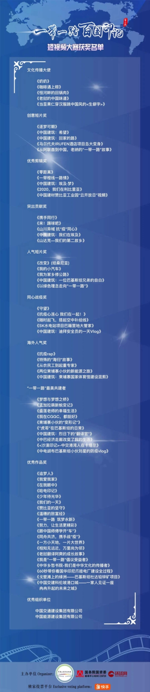本屆大賽獲得了眾多參與“一帶一路“發(fā)展建設的大型企事業(yè)單位及個人的響應,共征集了來自近80個國家的500余部參賽作品。經(jīng)過公眾投票與專家評審的兩輪角逐,本屆大賽最終評選出文化傳播大使獎、創(chuàng)意短片獎、優(yōu)秀剪輯獎、突出貢獻獎、人氣短片獎、同心戰(zhàn)疫獎、海外人氣獎各5名,“一帶一路”最美共建者 10名,優(yōu)秀組織單位 2個,優(yōu)秀作品獎20名。