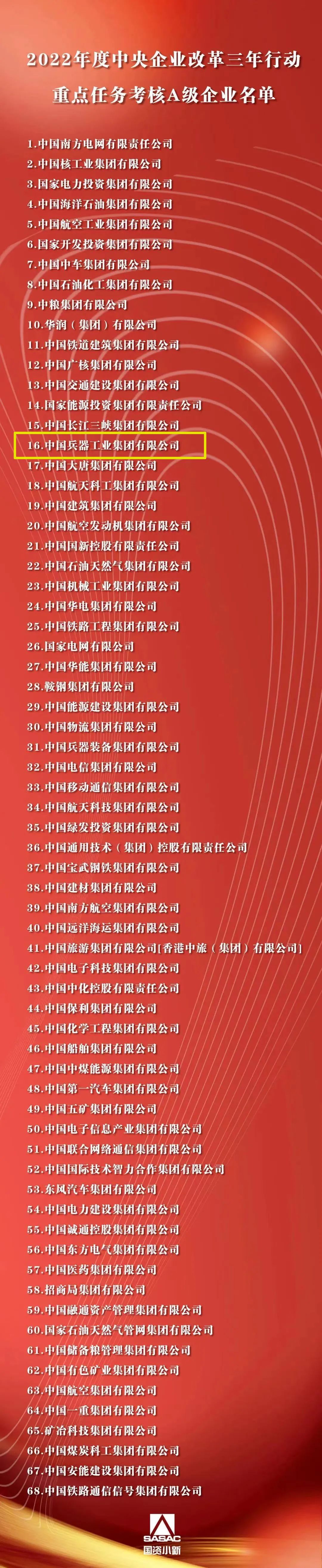 根據(jù)《中央企業(yè)改革三年行動重點(diǎn)任務(wù)考核實(shí)施方案(試行)》和《中央企業(yè)改革三年行動重點(diǎn)任務(wù)考核指標(biāo)表(2022版)》,經(jīng)審定,國務(wù)院國資委發(fā)布2022年度中央企業(yè)改革三年行動重點(diǎn)任務(wù)考核A級企業(yè)名單,中國兵器工業(yè)集團(tuán)有限公司獲評A級。