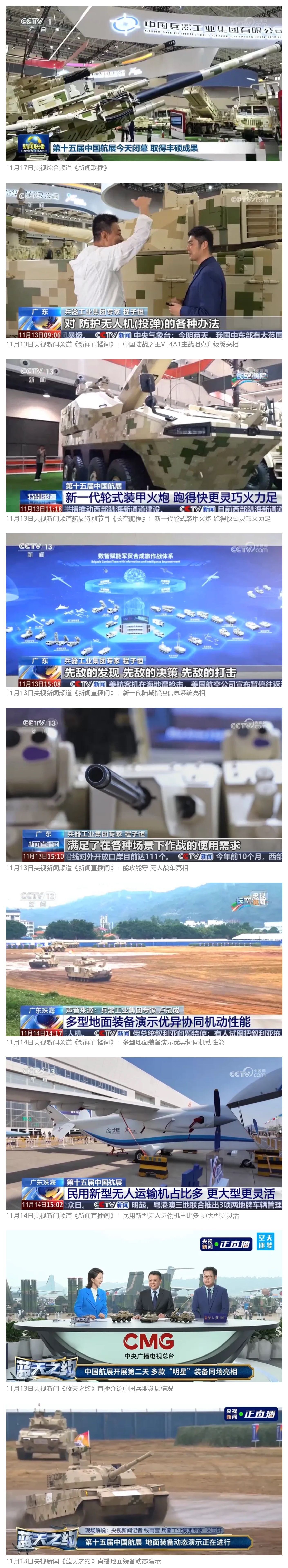 11月13日央視新聞《藍(lán)天之約》直播地面裝備動態(tài)演示此次航展,央視綜合頻道《新聞聯(lián)播》《晚間新聞》、新聞頻道《新聞直播間》《新聞30分》《朝聞天下》《共同關(guān)注》《東方時空》《午夜新聞》、財經(jīng)頻道《天下財經(jīng)》《經(jīng)濟(jì)信息聯(lián)播》《正點(diǎn)財經(jīng)》《第一時間》、中文國際頻道《今日環(huán)球》《中國新聞》、國防軍事頻道《軍事報道》《正午國防軍事》《國防軍事早報》《軍迷行天下》等欄目共播出兵器工業(yè)集團(tuán)參展相關(guān)新聞報道40余條。11月10日央視新聞頻道《新聞30分》11月10日央視中文國際頻道《中國新聞》11月10日央視國防軍事頻道《軍事報道》11月11日央視國防軍事頻道《正午國防軍事》